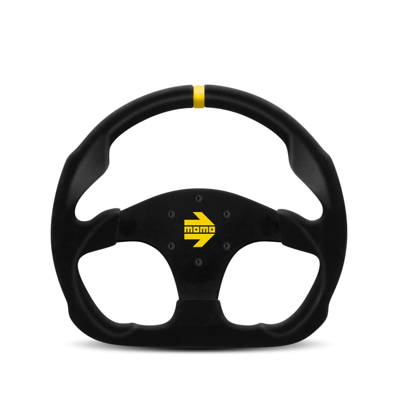 Volante MOMO MOD.30 de 320 mm en suede negro con base plana, diseño ergonómico racing y spokes de aluminio negro. Ideal para conducción deportiva y track-day, entrega máxima precisión y control.